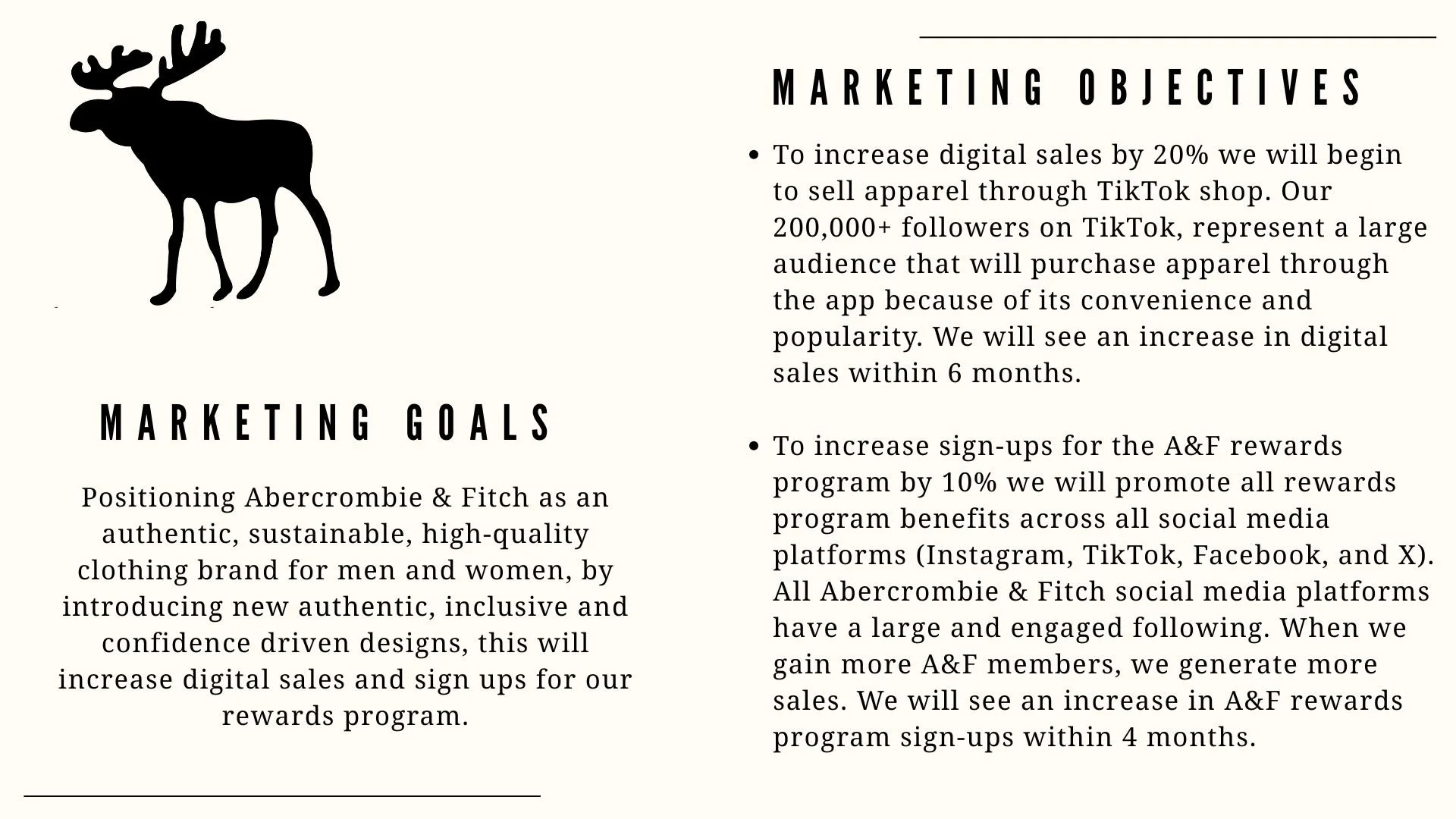 I developed a marketing plan for Abercrombie & Fitch which focused on increasing digital sales by launching the brand on TikTok shop, strengthening brand engagement through TikTok campaigns, and promoting the A&F rewards program to increase sales, brand awareness, and customer satisfaction.